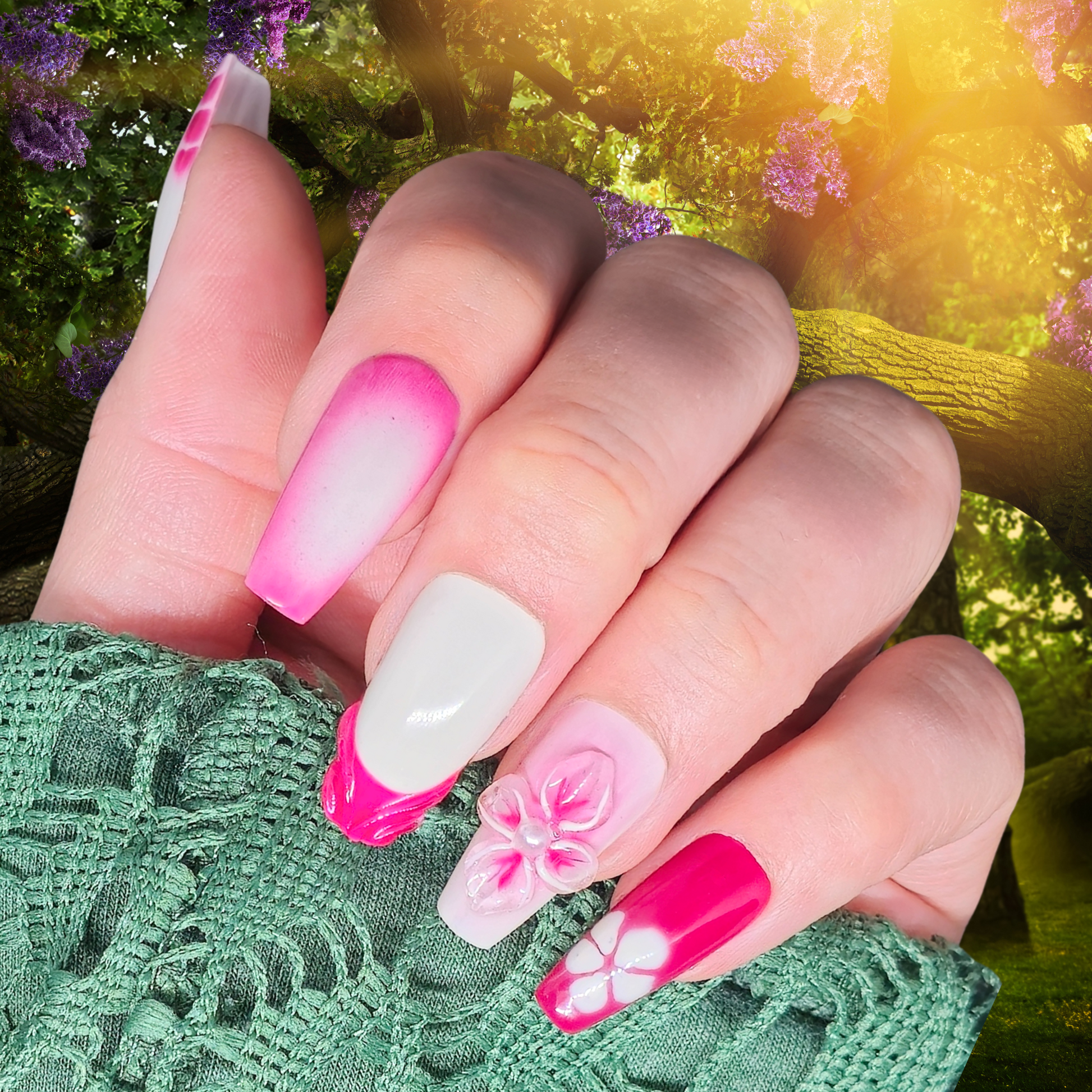 Un dégradé subtil habille l'ongle de lumière, et chaque détail évoque un printemps mystérieux, une douceur affirmée.