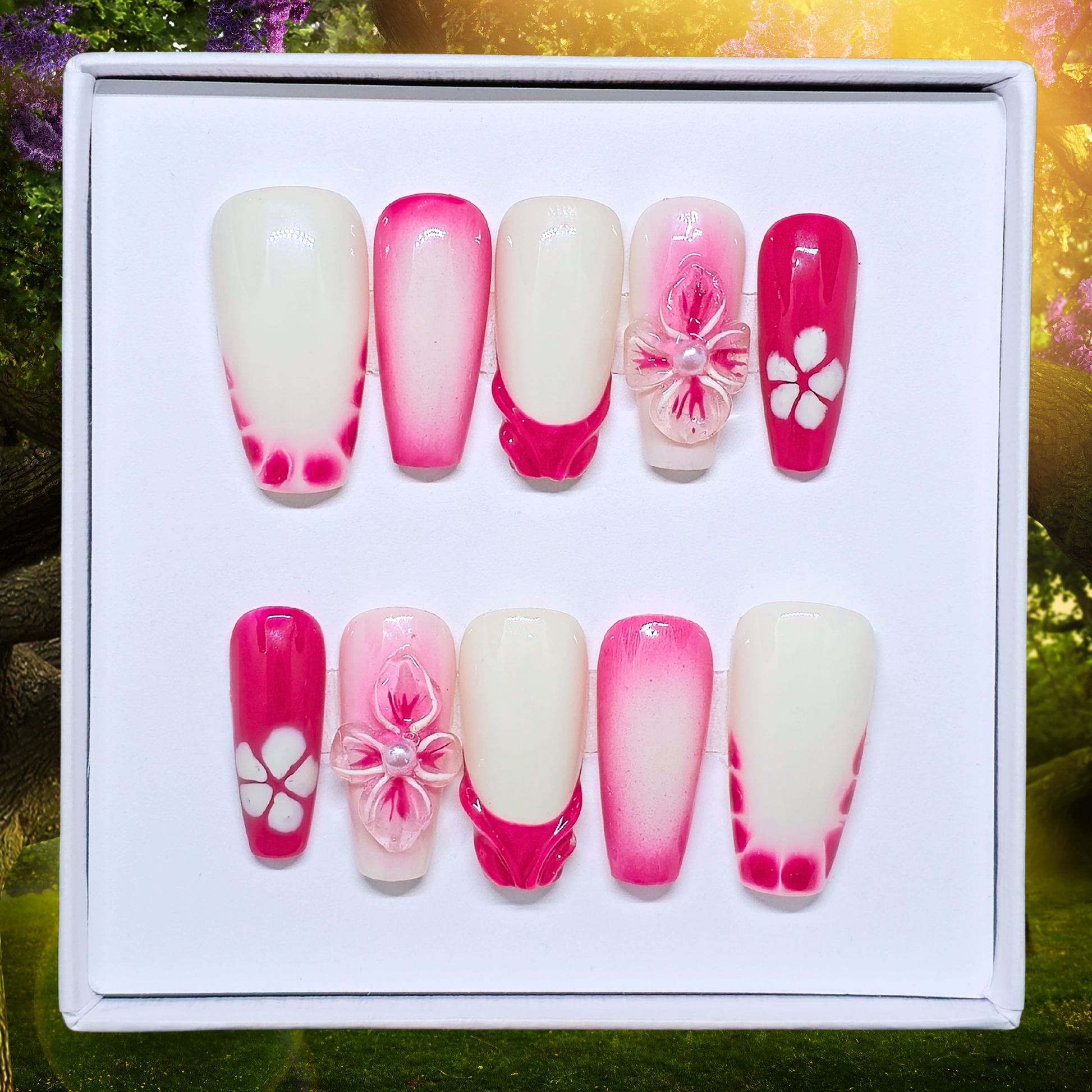 Elle est d'une composition florale artistique qui mêle le romantisme à la fantaisie. La rose fuchsia éclate comme un rayon de passion, tandis que les fleurs en 3D sculptées à la main apportent une touche couture et féerique.