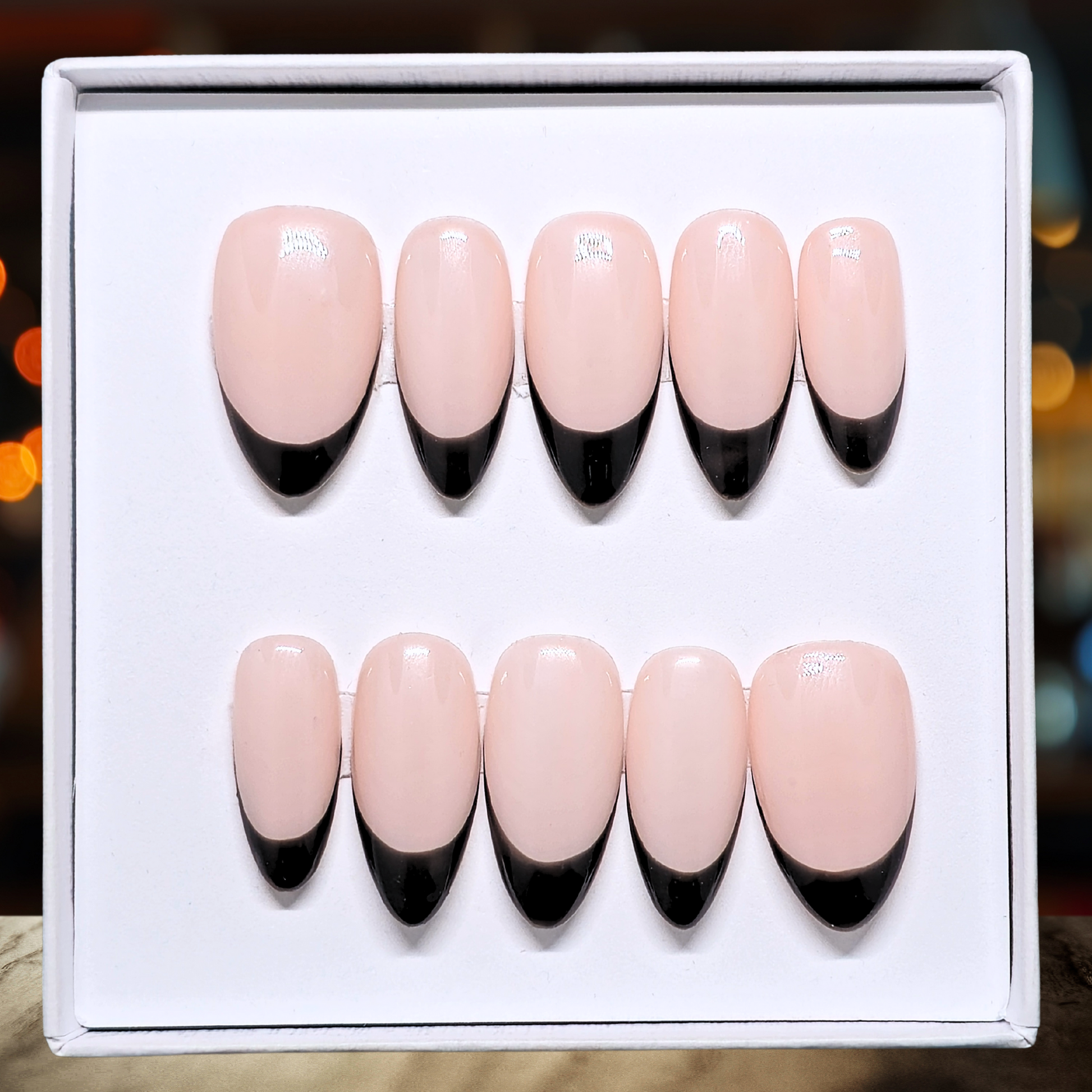 Elle incarne le contraste parfait entre sensualité et assurance. Une base nude subtilement rosée se pare d'une french noire ultra brillante, comme une touche de mascara sur un regard doux.