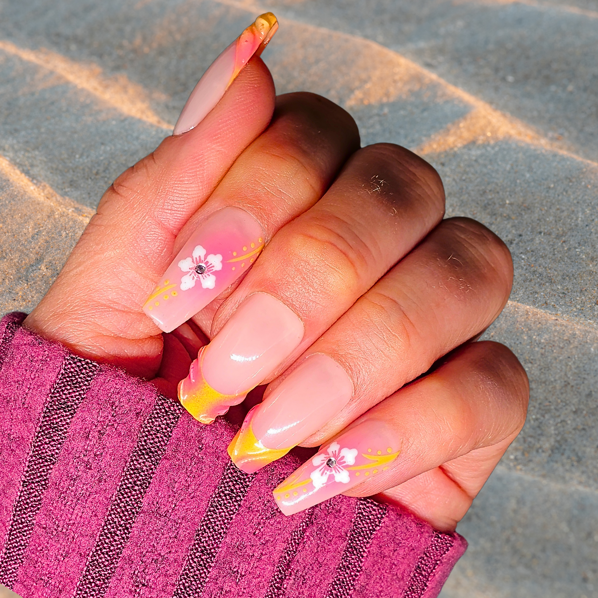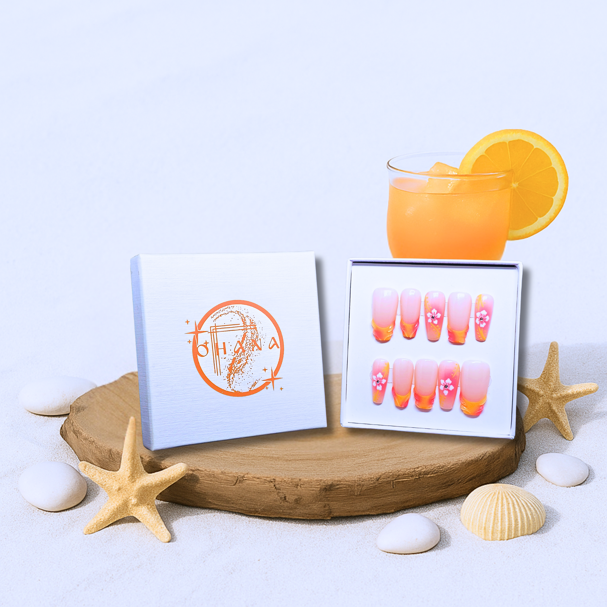 Soléïs , c'est une onde de douceur lumineuse. Avec ses dégradés corail-orangé et sa french sculptée comme une vague chaude, elle évoque les soirs d'été et les aurores tendres. Une fleur nacrée en son cœur, et tout s'illumine. Pour celles qui veulent porter un fragment de lumière, comme un soleil couchant sur une peau dorée.