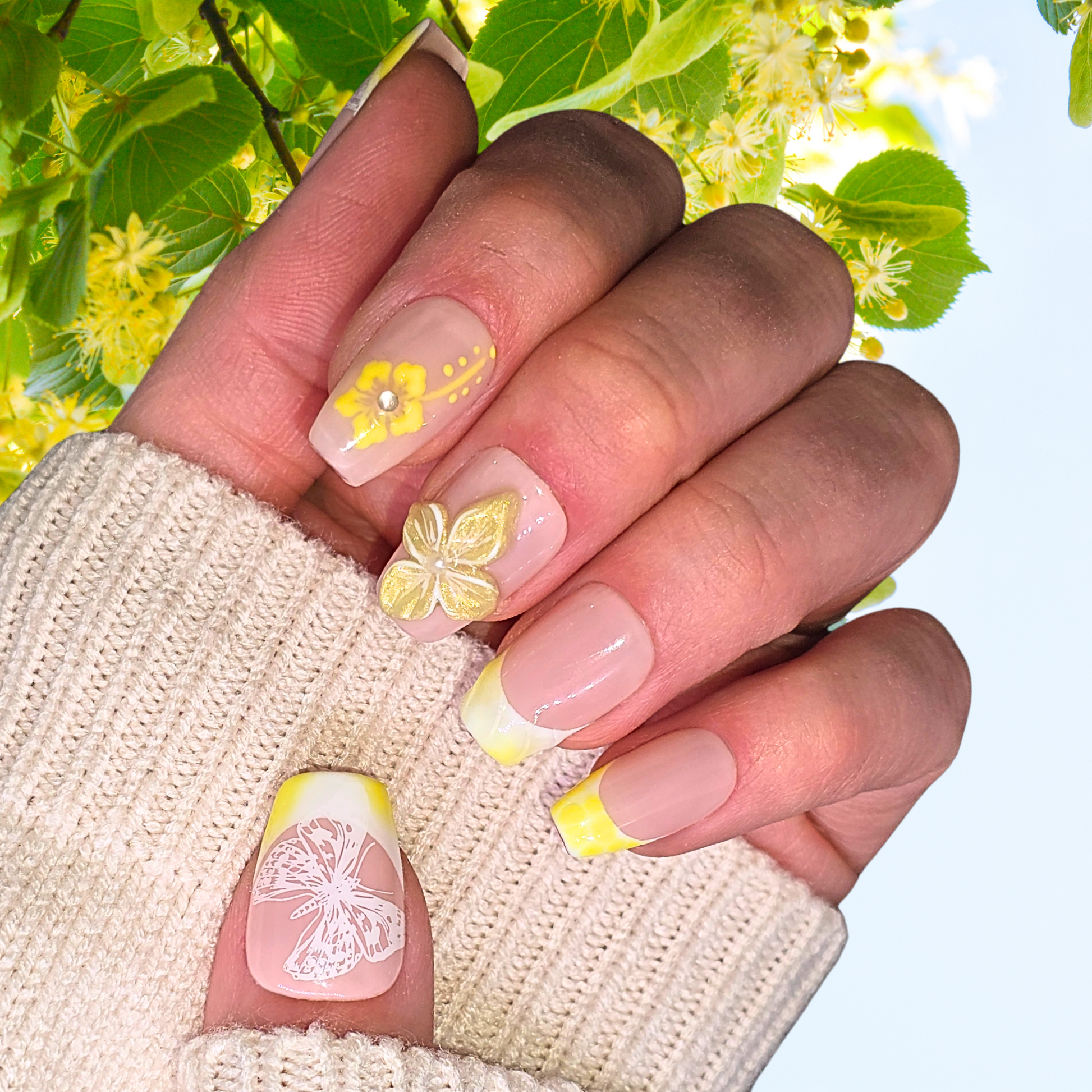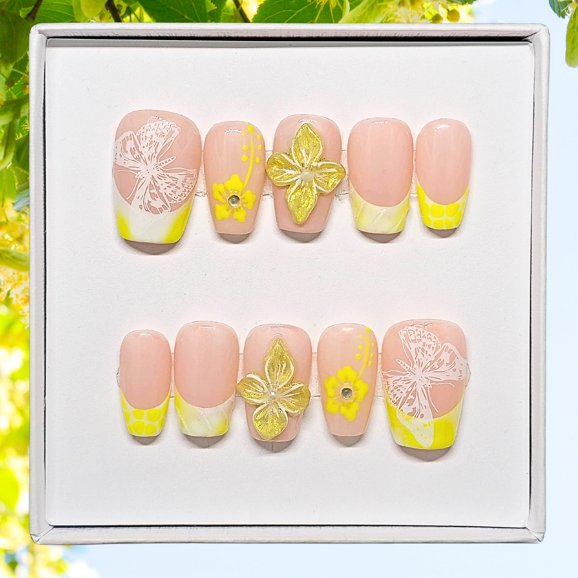 Soline célèbre la joie simple et l'éclat naturel. Entre french ensoleillée et fleurs tendrement sculptées, cette pose fraîcheur apporte douceur et légèreté. Parfaite pour illuminer votre quotidien d'un éclat doux et féminin.